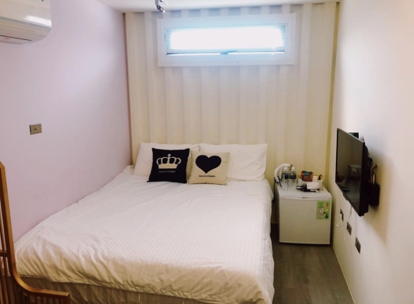 雙人房的房型不會因為是貨櫃屋就少東西,竟然還有冰箱,小型的沙發椅!