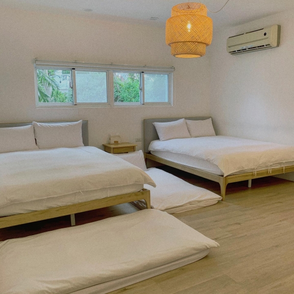 民宿總共有三間房,平房一層,一間雙人房以及兩間四人房~超過十人可額外多加四床,加床費用為 800元/床,內包含早餐、一組單人床被、盥洗備品!