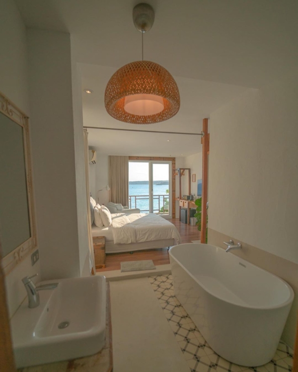 房內的衛浴設備皆為開放式設計,浴缸就放在床旁邊,不同房型有些微的不同,邊泡澡邊直望露臺外的山海美景,絕對是渡假最享受的事情啦!