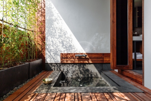豪華雙人的房型附設大陽台,溫潤的原木與石材、寬且靜的品味空間,適合2~3人輕奢華旅行。半露天泡湯浴缸與獨戶專用的造景大露臺,獨享熱鬧城中的靜謐一隅!