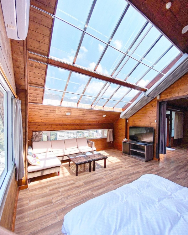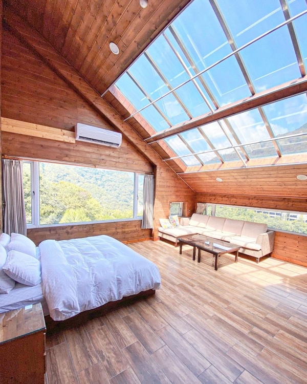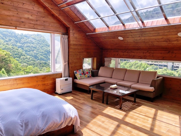 這間絕對為最受歡迎的房型,寬敞舒適的空間,還有超大的銀河天窗,夜晚躺著數星星,絕對是最浪漫的事情了!還有沙發可以休憩,窗景溫泉浴缸更是令人嘆為觀止,望出去就是廬山百萬山景。