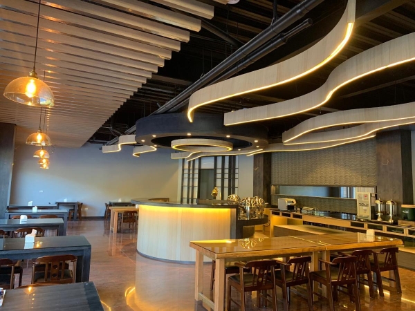 走進大廳,高挑時尚的裝潢,而左邊一扇門進去就是餐廳,入住可以預約晚餐,在這裡吃火鍋,還能邊賞美景,除了有口福也有眼福,戶外的大眾溫泉湯池,還有高壓水柱可以沖走一身疲憊,非常適合一家大小來旅遊!