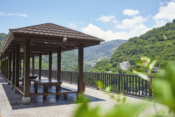 民宿前還有一處涼亭座位區,可以在這喝茶聊天,或是自備食物鍋具,自炊,還能一賞戶外山景,真的是很愜意!