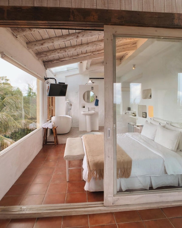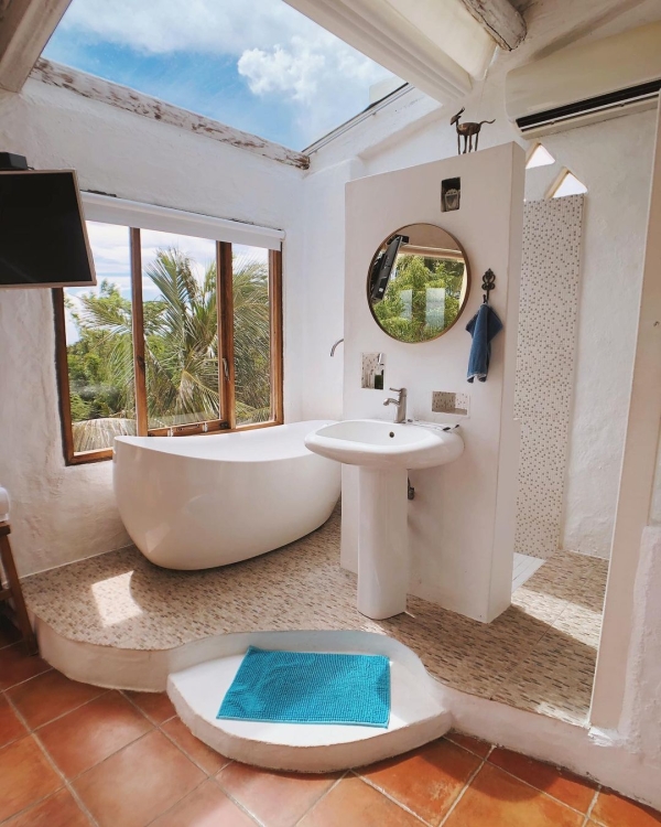 開放式的浴室,讓人有一種與森林共浴的感覺超級放鬆身心!透明的窗在浴缸泡澡還能欣賞湛藍大海,夜晚抬頭透明的天窗仰望星空數星星!很適合情侶小小蜜月極度浪漫!