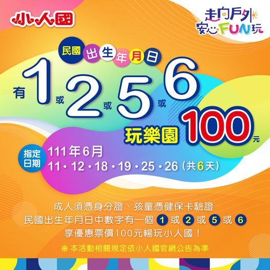 只要民國出生年月日中數字有一個「1」或「2」或「5」或「6」,暢玩小人國100元!成人須憑身分證、孩童憑健保卡驗證,大、小朋友都適用,揪團玩一波!