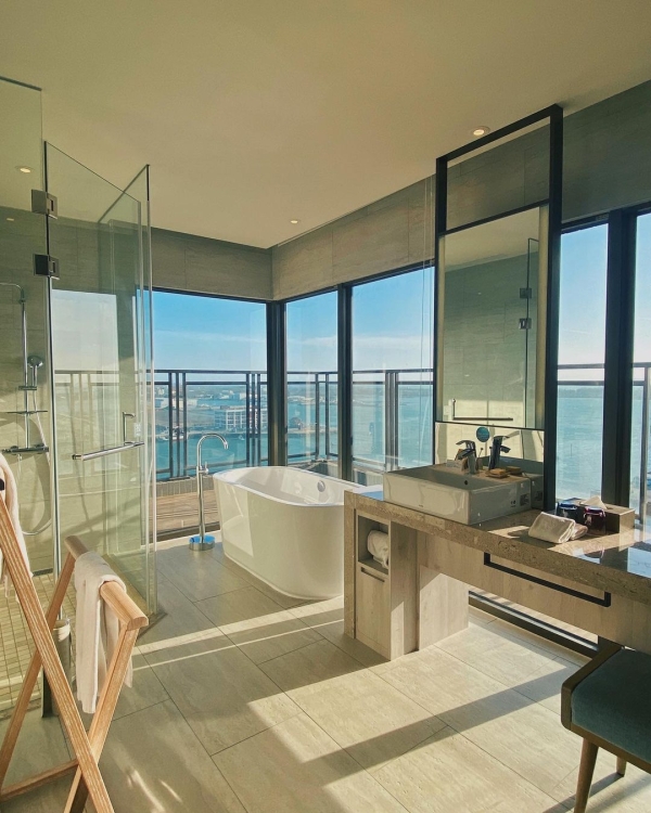 海上船屋概念澎澄房型,設計風格展現航海時代的多元文化融合古典元素,旅客能在落地窗邊享受午後的靜謐時光,一覽港景或園景的醉人景色。