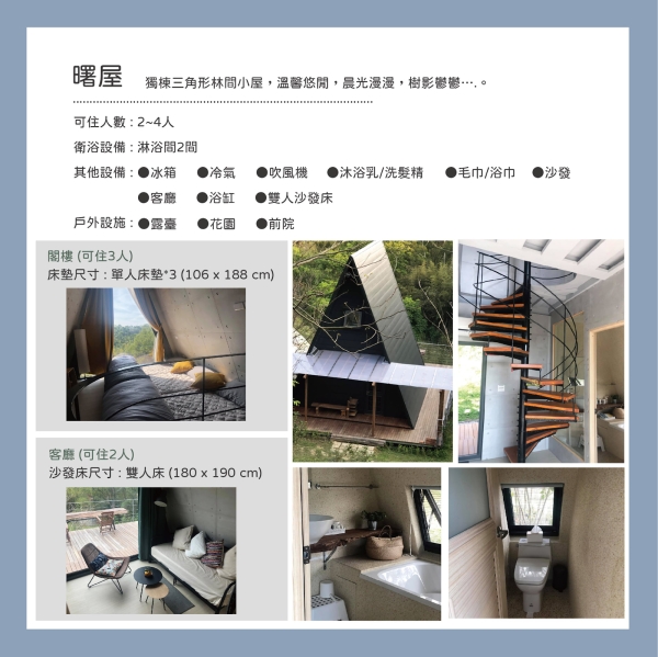 很適合閨蜜情侶來趟小旅行,內部裝潢簡約也很舒適,外觀是可愛的三角形拍照也很好拍!除了獨棟木屋可以選擇之外還有其他的房型!