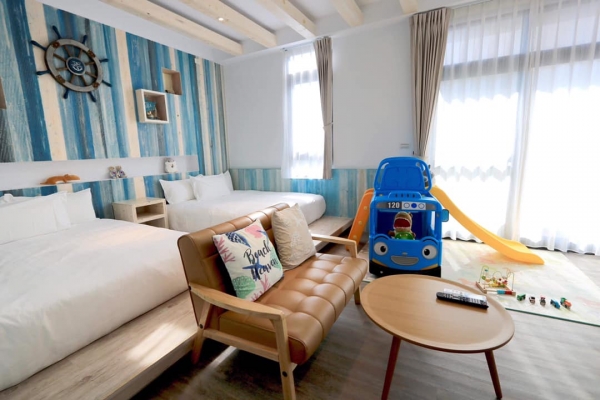 海洋主題的親子房型,還有超可愛的卡通車滑梯可以玩,帶小孩出來玩不用怕無聊,溫馨又繽紛的色調,讓心情愉悅了不少!