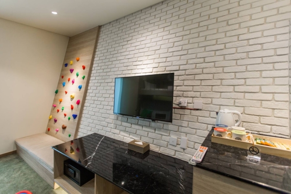 以親子樂遊主題為主,房內配備孩童喜愛的溜滑梯、室內攀岩牆、小型翹翹板、簡易小帳棚