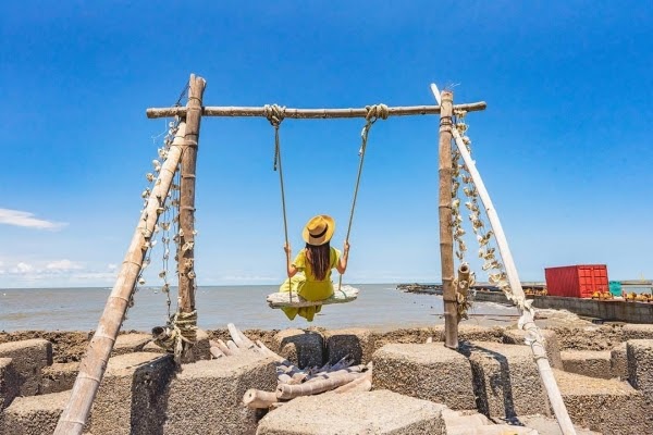 不用跑到沖繩,現在四湖就有沙灘漂流木盪鞦韆!利用海邊廢棄物打造而成,坐在鞦韆上吹著海風,欣賞大海、夕陽美景,加上一排排的白色風車實在太美啦!