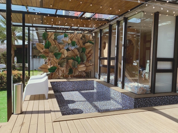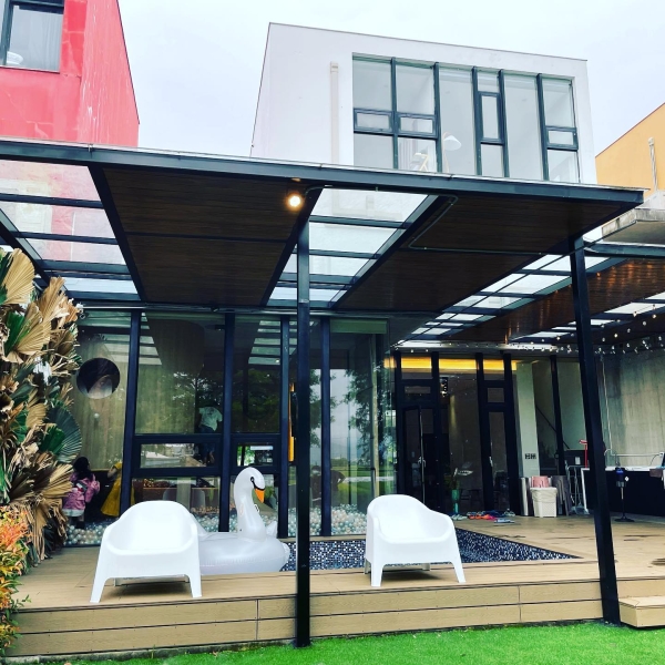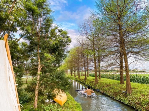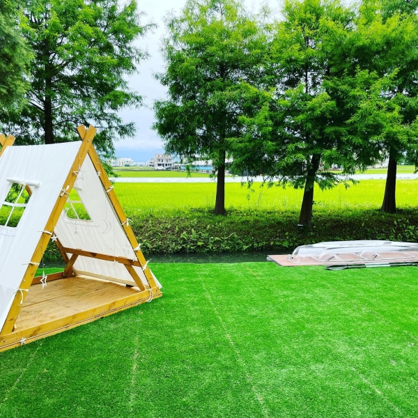 民宿後有著漂亮的落羽松庭園,人工草皮上擺放純白帳篷,一旁的小水道可以體驗玩獨木舟,屋簷下是半戶外空間的戲水池,晚上就在這裡烤肉遊玩好不愜意。