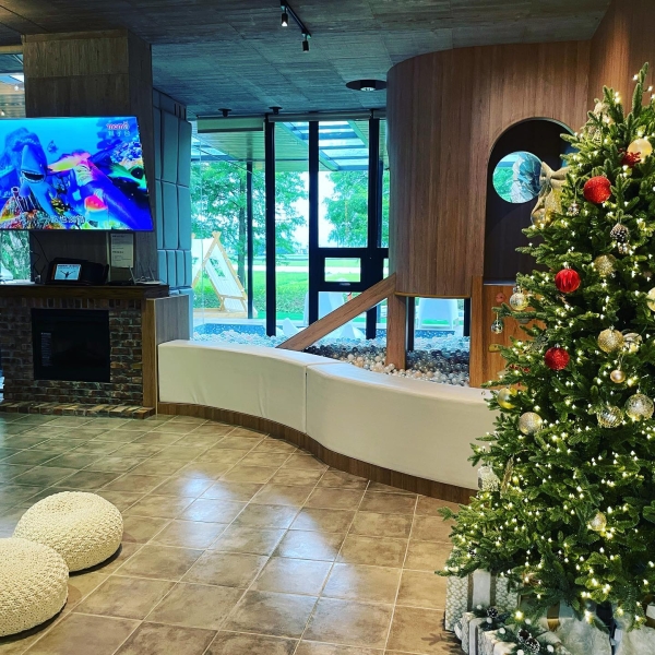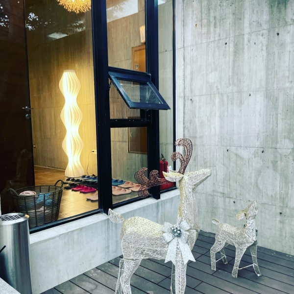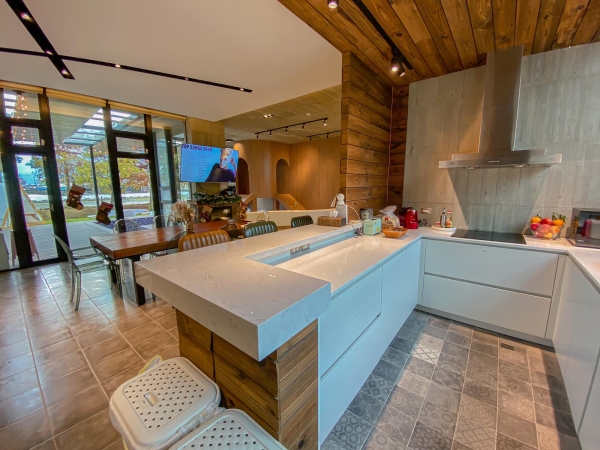 民宿外觀是一棟低調的清水模建築,屋內裝潢簡潔高雅,是個讓人放鬆的空間。而最吸引小朋友的就屬大廳裡的遊戲區,有攀岩牆、木屋、溜滑梯與球池,大人們在大廳聊天唱歌,小朋友就在旁邊開心玩,氣氛歡樂。