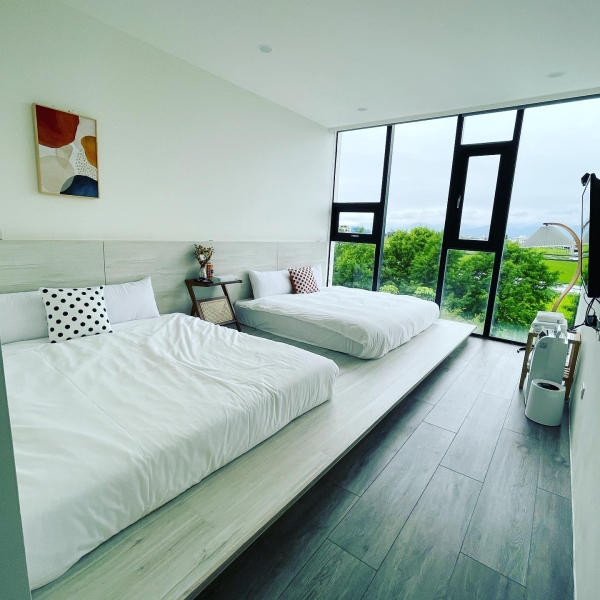 民宿內的房型寬敞舒適,整面落地窗就在床旁邊,起床就能一賞戶外稻田美景,好愜意!