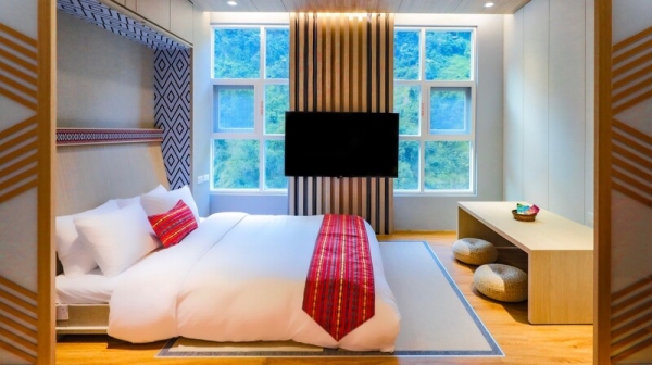 客房採泰雅編織圖紋設計,並運用大片窗戶將山色融於房內,雙人房更設置和洋休憩區,旅客能在夢幻的窗景下翻本書消磨時間,夜晚聆聽著大甲溪流水聲入睡,早晨再被自然喚醒。