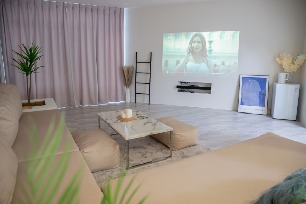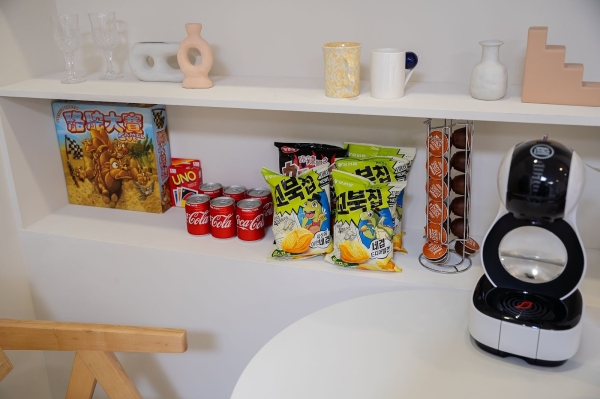 提供Netflix片源收看,搭配120吋超大投影機加上豪華音響,根本就是電影院包場了!吧台區還有提供冰箱,旅人可以免費使用礦泉水、可樂、膠囊咖啡機與餅乾!