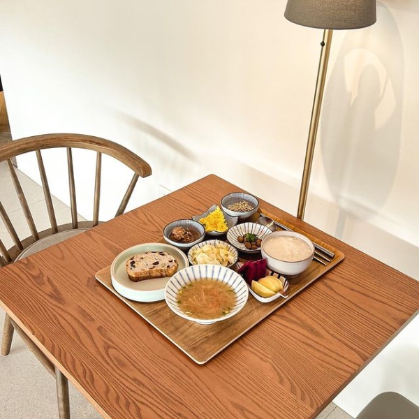 民宿供應的早餐為中式清粥小菜,用精緻的日式碗盤盛裝,配上新鮮切好的水果。為了滿足留宿的旅客,山房會變換不同的中西菜式,不同的風味,同樣的美味滿足旅客的味蕾。
