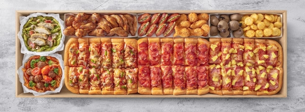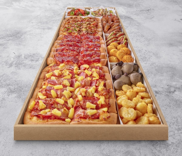 顛覆以往圓披薩形狀,這次把披薩變長方形,組合包含三款口味任選的經典大披薩,還可選擇兩款獨家紙包筆管麵,還能爽吃人氣熱烤副食,烤雞、QQ球等,多達10款餐點超享受!
