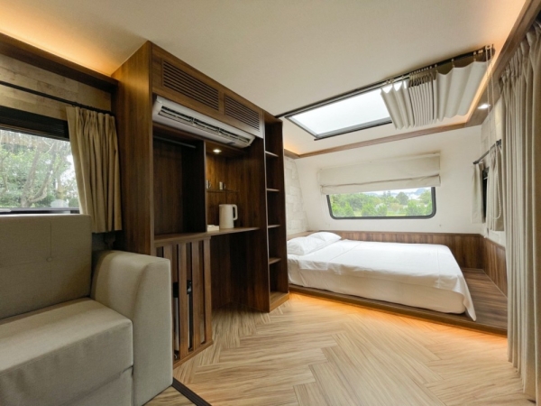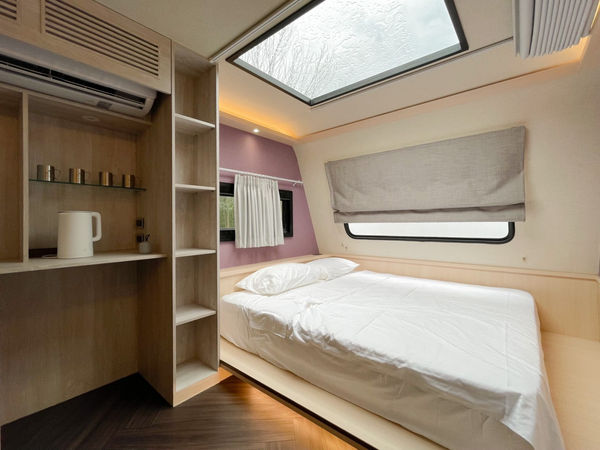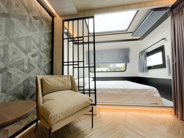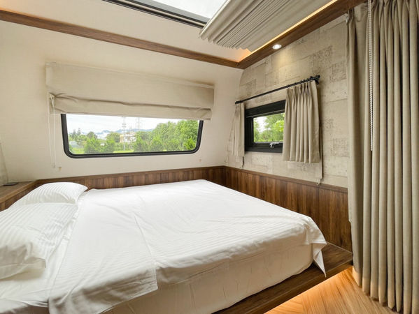 園區內總共有20台寵物友善露營車,每車皆採獨立衛浴設備、獨立星空露台,最低一人不用3000就能入住,房內設有天窗,拉開窗簾就能賞星星、聽著蟲鳴鳥叫,度過充滿野趣的浪漫夜晚!