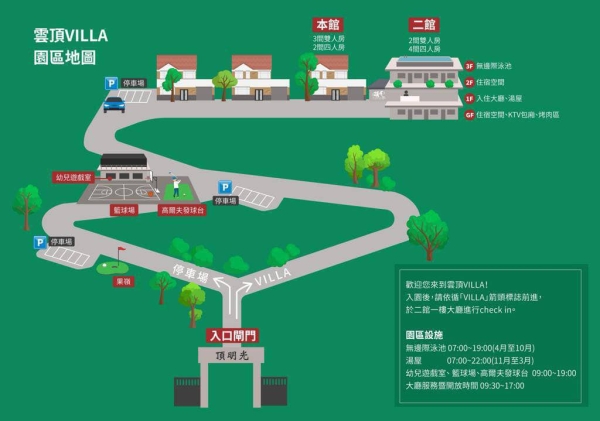 雲頂Villa設施非常豐富,園區內有籃球場、高爾夫發球台、賞花步道及幼兒遊戲室!家庭旅遊來這裡絕對是首選,不僅環境優美還有多樣的設施可以玩樂!