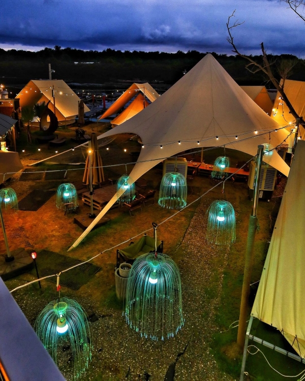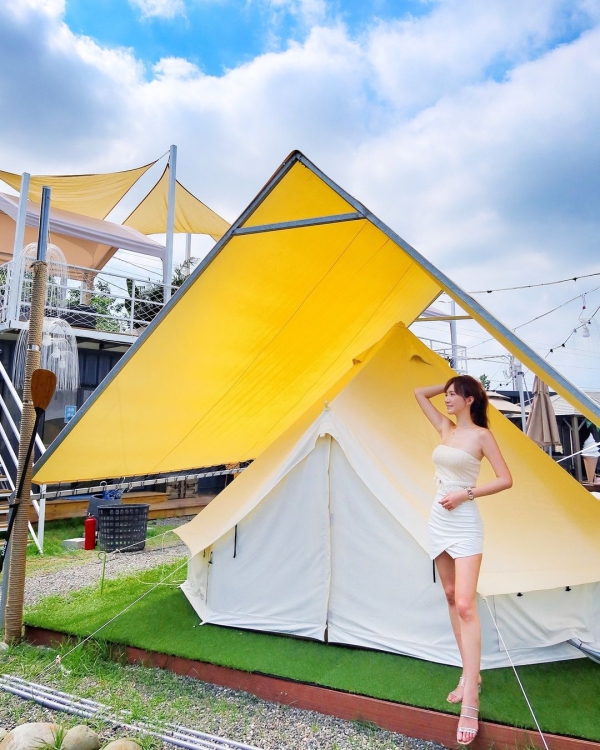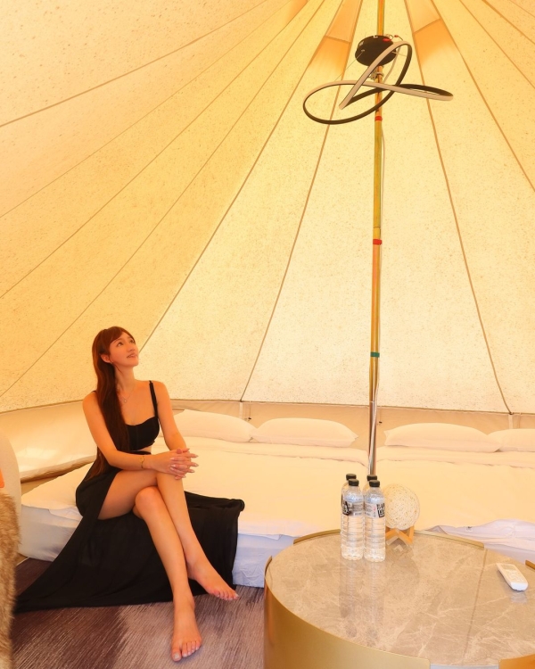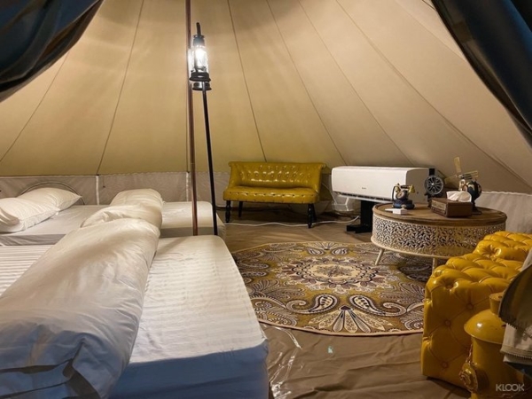 園內提供的是最夢幻的神殿帳篷,看起來雖然不大,裡面卻寬敞無比,設備應有盡有,除了睡墊以外,還有附冷氣、沙發、桌椅等等~不想曬太陽也可以在帳棚內好好的放鬆一波~
