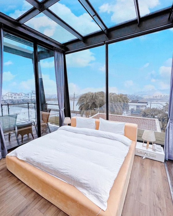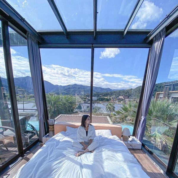 高人氣的「豪華加大雙人床房」,就是傳說中的玻璃屋,一進房就讓非常驚豔!房間全是玻璃,三面都是落地窗,天花板也是玻璃,所以視野超開闊!每間房間均有景觀泡澡浴缸、乾溼分離及獨立的陽台。