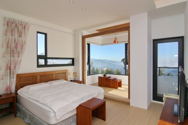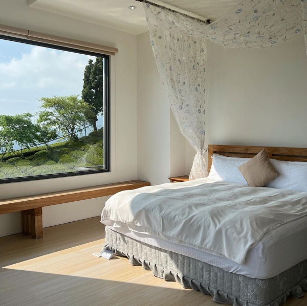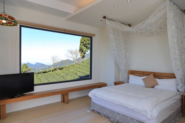 房間視野超級好,擁有絕美大片玻璃落地窗,躺著就能賞夕陽雲海日出,好浪漫呀!