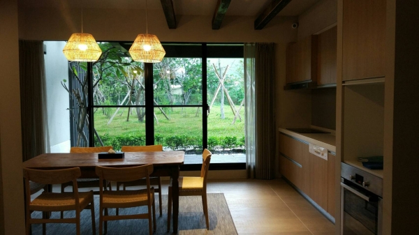 每一棟都有專屬公共客廳以及廚房餐桌,很適合家族旅行包棟入住,裝潢以原木色調為主,溫馨舒適,而且都有超大落地景窗可以依賞戶外的山水風光,坐在編織吊椅上,好愜意阿!