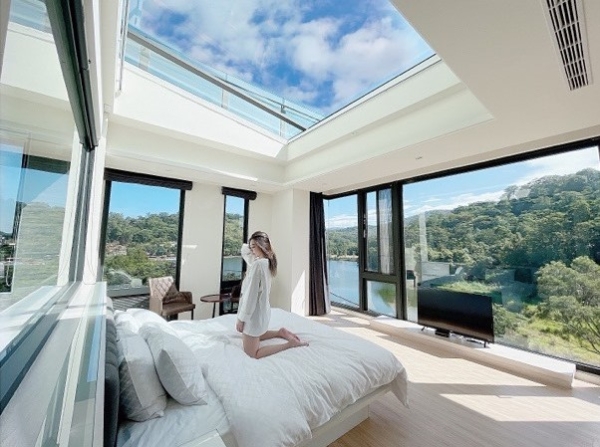 而房型中最吸睛的就是這間湖景星空雙人房啦!周圍大片玻璃窗,使得採光非常好,視野也極佳,還設有超大天窗,躺在床上就能望向戶外無敵美景,到了夜晚還能直望滿天星空,絕對是必住的房型!