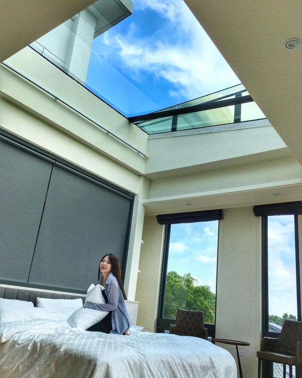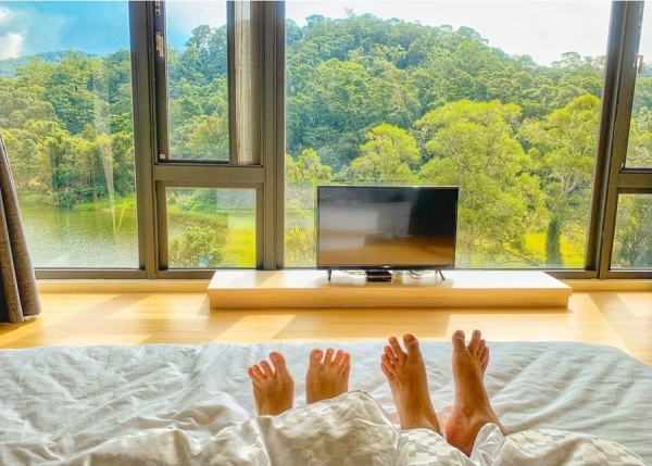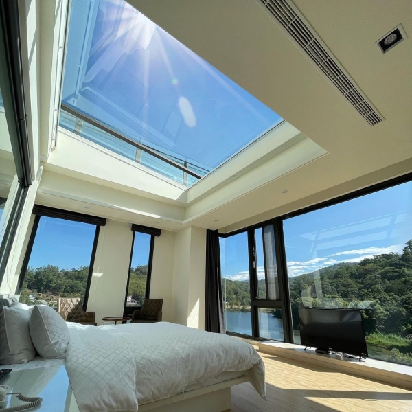而房型中最吸睛的就是這間湖景星空雙人房啦!周圍大片玻璃窗,使得採光非常好,視野也極佳,還設有超大天窗,躺在床上就能望向戶外無敵美景,到了夜晚還能直望滿天星空,絕對是必住的房型!