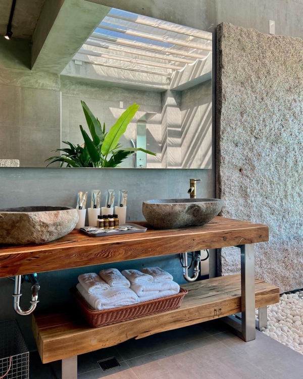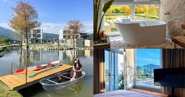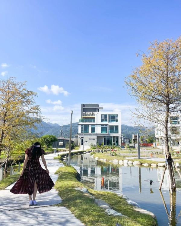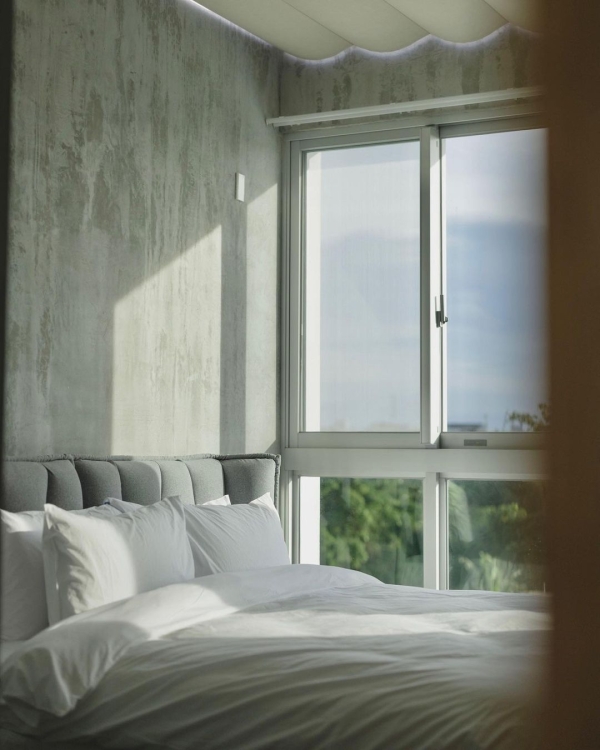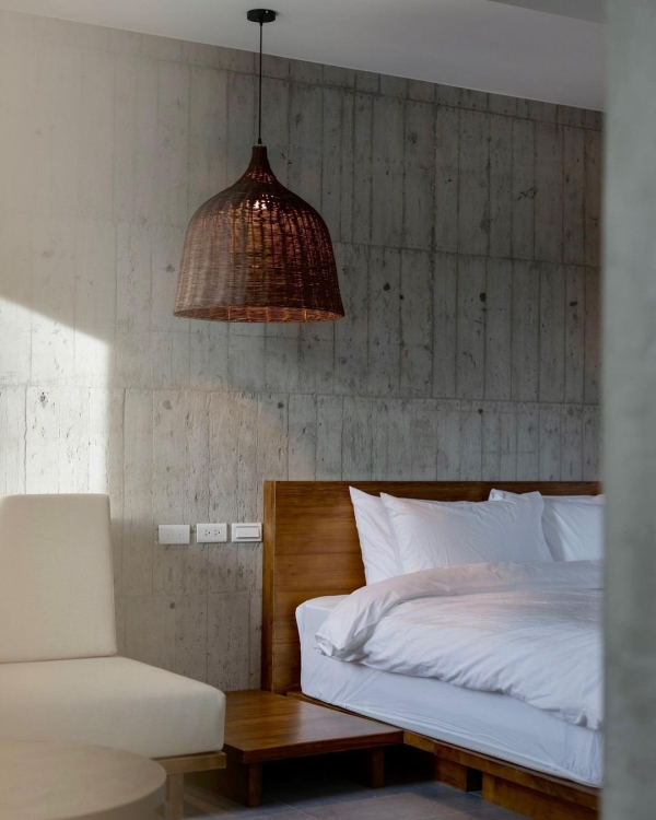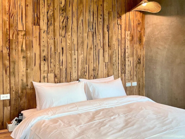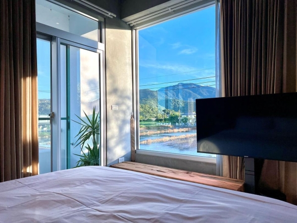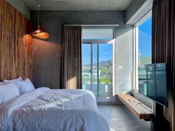 台灣檜木砌成的房間主牆,原木系的裝修與混凝土漆面結合,木質調的房間、暖色系燈光,透過房內大窗便能欣賞青山和田野的景緻,不自覺讓人放鬆。