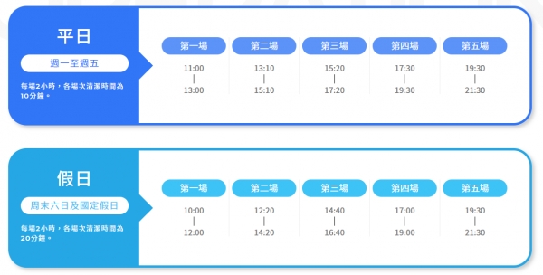 開幕前三天為特殊優惠,僅限臨櫃購票。這三天第一場皆為10-12點,早上9:30開始售票。