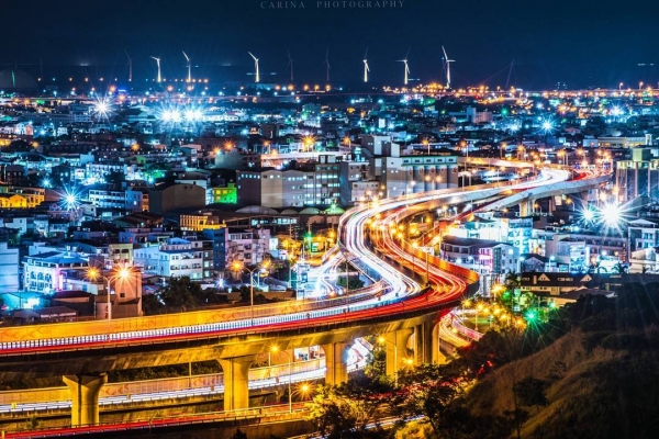 經過幾個轉彎~來到慈暉亭前的大草坡!往高美的方向看即可看到中清路八段的高架橋蜿蜒進入市區,晚上利用慢快門即可拍出此千萬級的夜景,遠方整排風車處即是高美濕地~