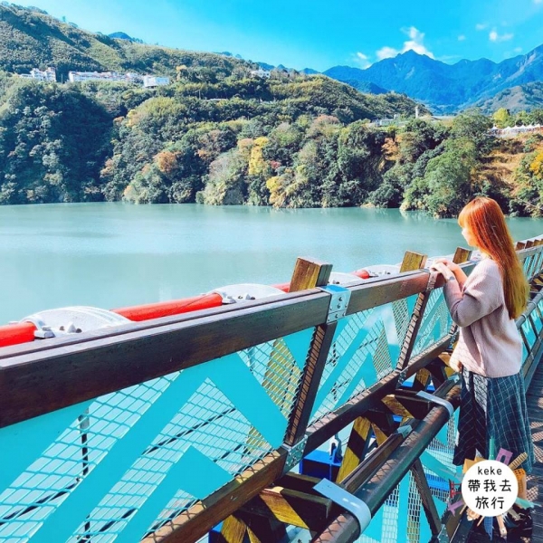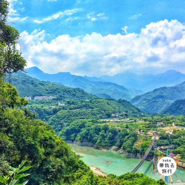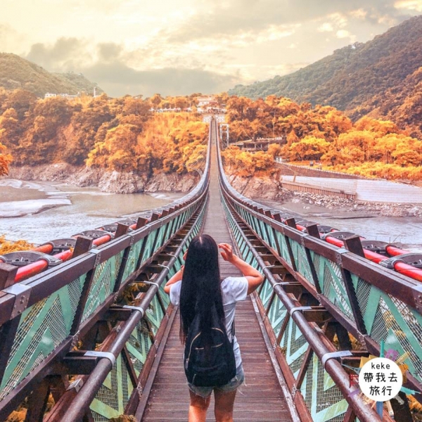 吊橋本身採紅綠配色,對稱的橋身、山水均勻環繞四周搭配著晴空萬里,這大概就是它跟其他橋不一樣的地方吧!中途還能看見舊的橋墩,感覺穿越了它就能到達魔幻的世界!雖然需要走上一段路,但踏上吊橋的瞬間就覺得超值得,大漢溪、溪口台地的美景盡收眼底,從山間遠望吊橋也超漂亮。腳下的溪水翠綠的讓人著迷,遠方的群山圍繞讓人超放鬆。照片真的隨便拍隨便美啊!