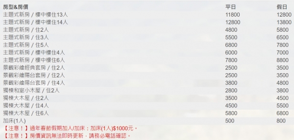 住宿優惠:平日NT. 11800 元、假日NT. 12800 元、節日NT. 16800 元
