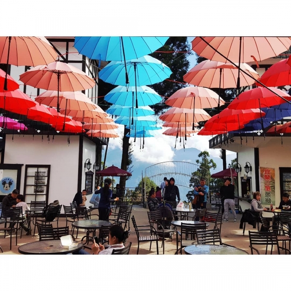 小瑞士花園外的新商圈,戶外的休憩區,打造成傘巷的感覺,五顏六色的雨傘掛在上方,看起來活潑又繽紛。原來這些彩色的雨傘,不只是裝飾品,也可以當成美麗的遮陽棚,坐在下上享受著陽光若有似無的洗禮,山上涼爽清新的空氣,讓人覺得十分的舒適。